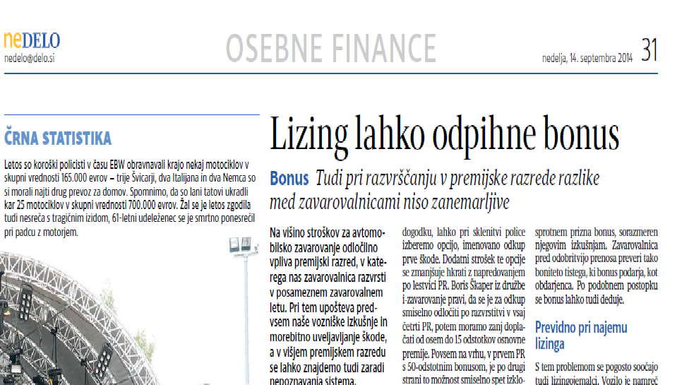 Pri prvi sklenitvi avtomobilskega zavarovanja nas zavarovalnice avtomatično uvrstijo v 14. premijski razred (PR), zato prvo leto plačujemo izhodiščno zavarovalno premijo. V naslednjih letih vsako leto brez škodnega dogodka napredujemo za en PR niže in smo s tem upravičeni do dodatnega petodstotnega bonusa. Za vsako prijavo škodnega dogodka nas po drugi strani v naslednjem zavarovalnem letu čaka skok za tri PR oziroma izguba petnajstih odstotkov doseženega bonusa. Sistem je načeloma enoten tako pri razvrščanju po PR v obveznem zavarovanju kot splošnem kasko zavarovanju, a pri prvem politike posameznih zavarovalnic nekoliko odstopajo, pojasnjuje Blaž Zalar iz podjetja Moj nasvet.